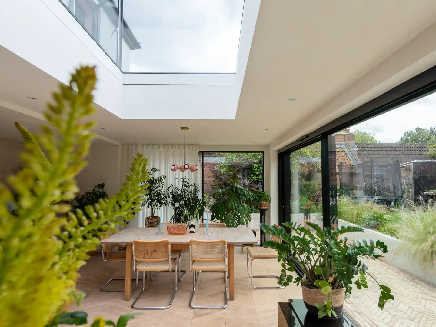 Vandaag de dag zie je deze stijl terug in moderne renovaties, waarbij oude woningen worden opgefrist met lichte kleuren, houten vloeren en veel daglicht. Denk aan een oud herenhuis dat wordt gerenoveerd met wit geschilderde muren, een Scandinavische houten vloer en grote VELUX dakramen voor extra lichtinval. Een concreet voorbeeld is een stadsappartement uit de jaren dertig dat werd omgetoverd tot een lichte, open ruimte door het verwijderen van tussenmuren en het plaatsen van brede houten planken en minimalistische meubels.