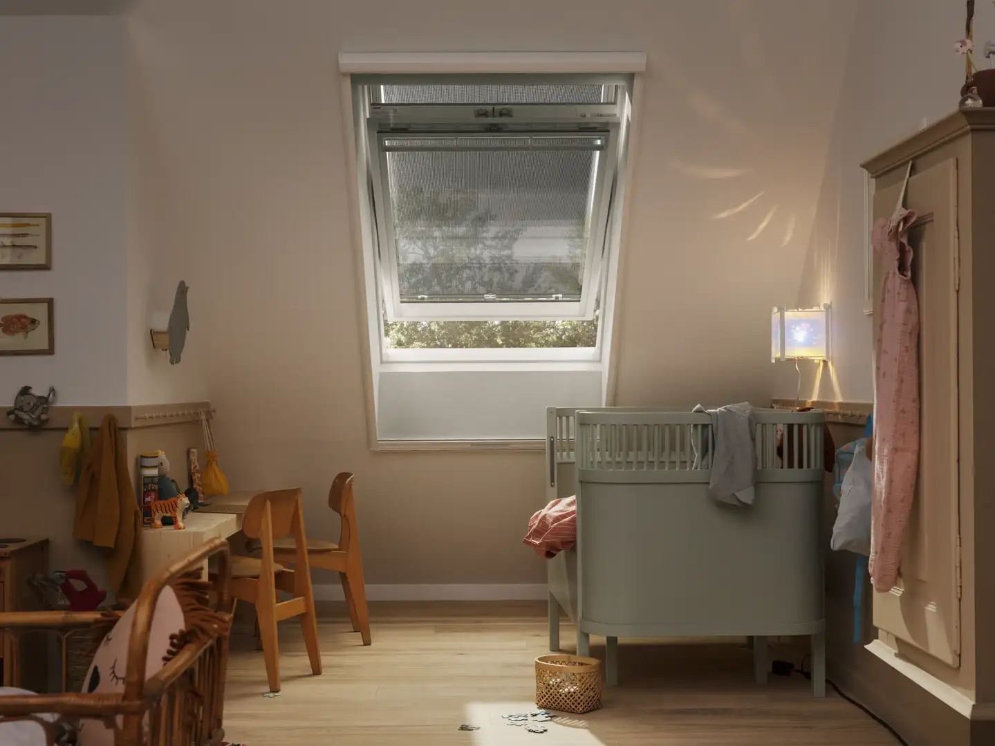 - VELUX ACTIVE with NETATMO: regel automatisch het openen en sluiten van dakramen en accessoires in de babykamer dankzij sensoren voor binnentemperatuur en luchtvochtigheid.